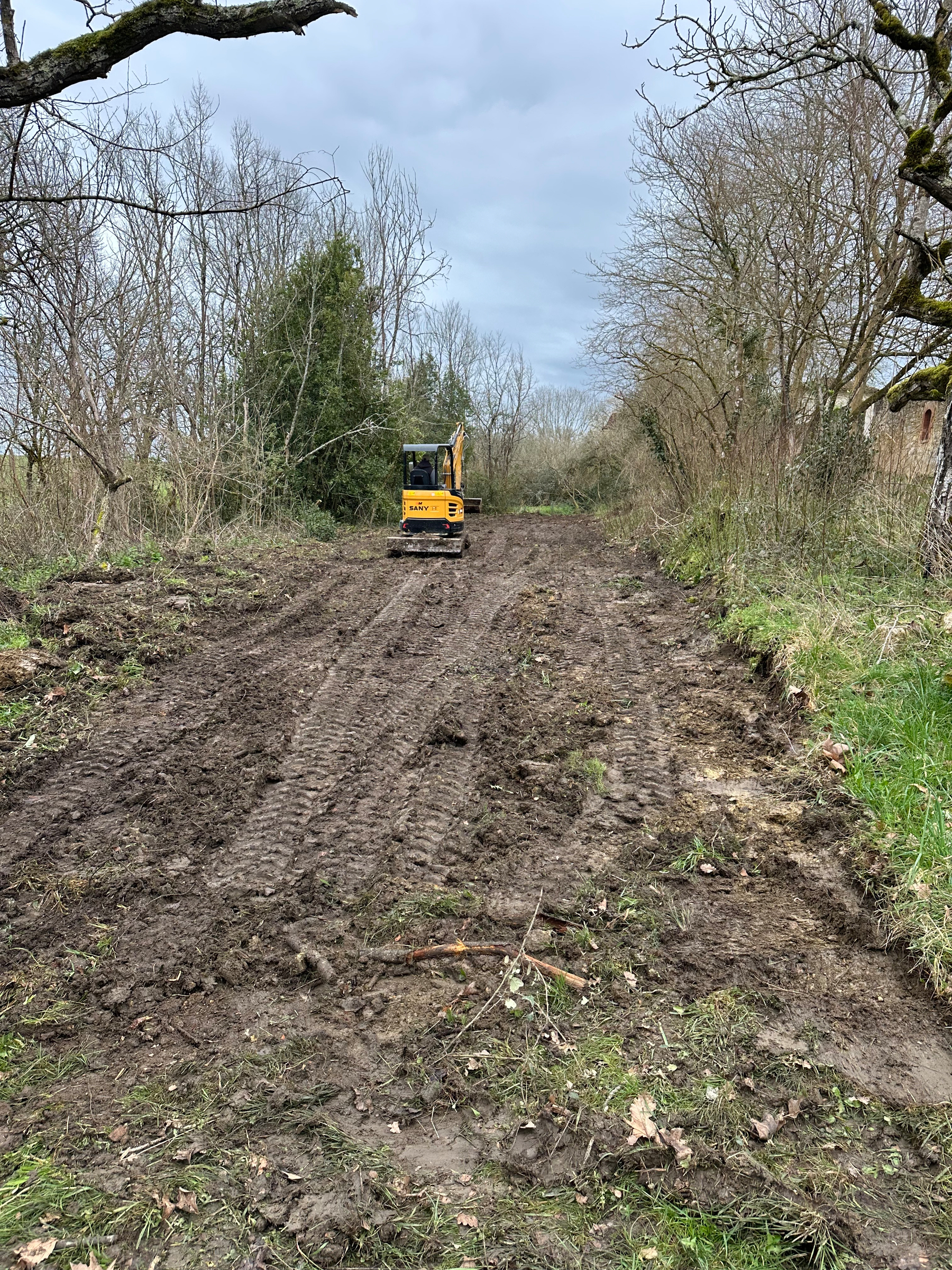 Last spring we started a little project to clean up some fallen trees that had been overgrown with blackberry and blackthorn thickets. We were hoping to clear what we thought to be a flat area about 8x8m to use as a storage area for gravel and tile. As we cleared we found that the flat area of thorns and deadfall was a bit bigger than we had expected. 120mx9m